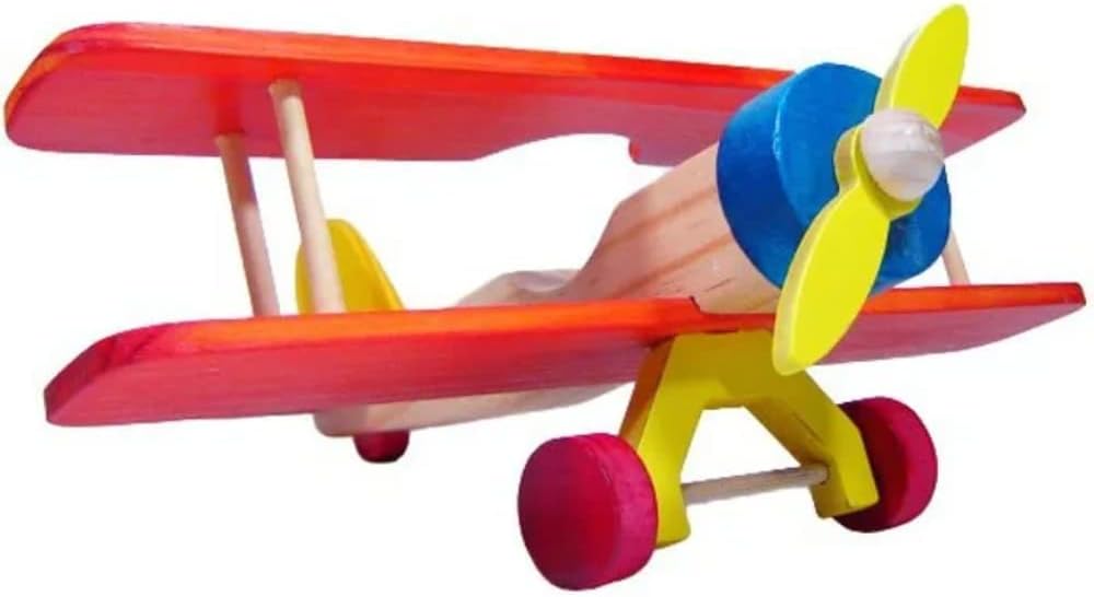 Avião bi-plano pintado em 4 cores, com hélice móvel. Produzido com madeira maciça de pinus. Qual criança que não gosta de avião? Brinque com a sua imaginação, e transforme-o em um incrível brinquedo de coleção. Desenvolve a coordenação psicomotora, criatividade, e discriminação de cores. Excelente Acabamento.