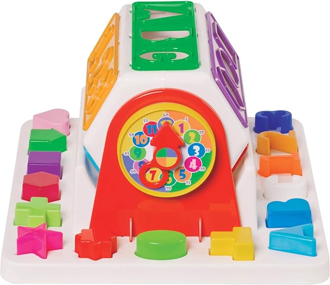 Incentiva a percepção, o raciocínio lógico, a coordenação motora e auxilia a distinguir formas e cores. Para retirar as peças é necessário retirar a tampa onde está o relógio.